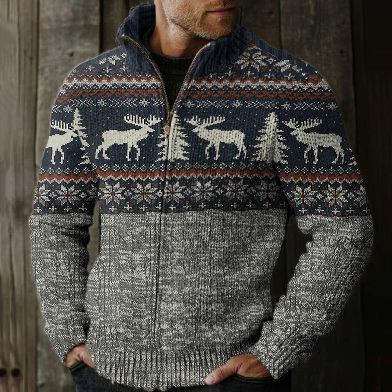 Men's Retro Tribal Reindeer Merry Christmas Deer Pattern Zipper Sweater